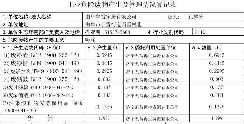 1.單位名稱/法人名稱 曲阜魯雪家居有限公司 法人: 孔祥濤 2.單位地址 曲阜市小雪街道西雪村北3.單位生態(tài)環(huán)境部門負責人及電話 孔亞明15153745608 4.行業(yè)類別代碼 21105.危險廢物產(chǎn)生的主要工藝 ...