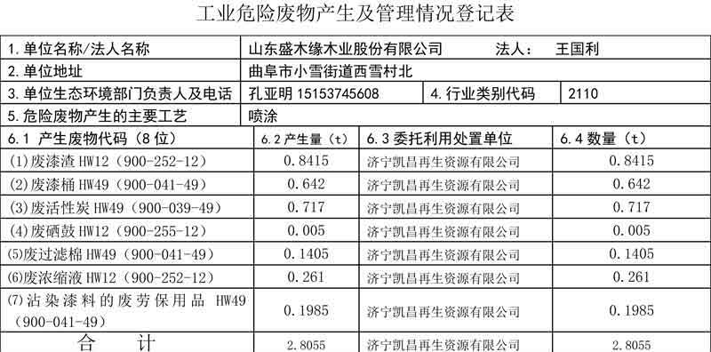 工業危險廢物產生及管理情況登記表 1.單位名稱/法人名稱山東盛木緣木業股份有限公司 法人: 王國利2.單位地址曲阜市小雪街道西雪村北3.單位生態環境部門負責人及電話孔亞明151537456084.行業類別代碼2110